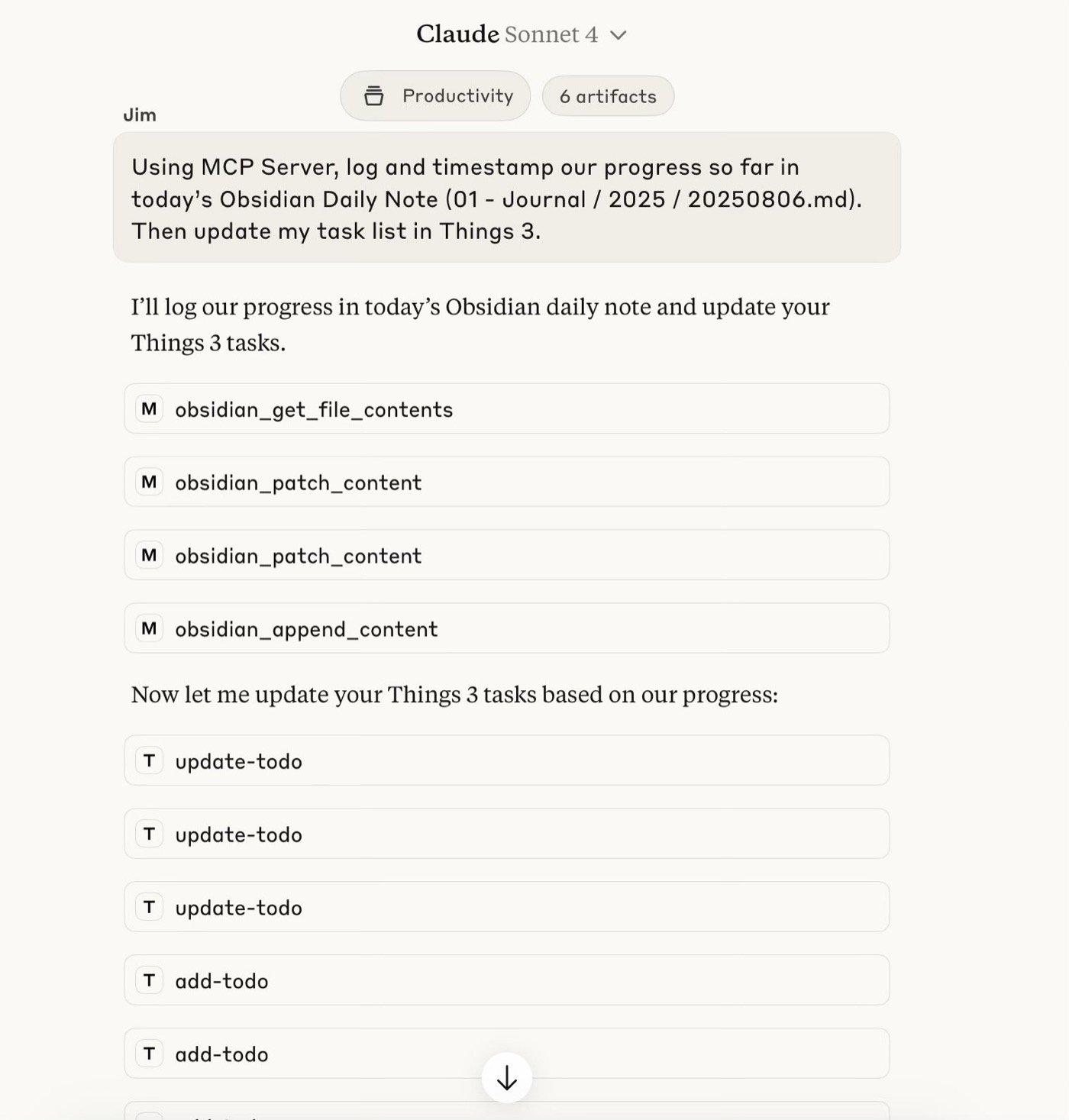 2. Claude + Obsidian + Things 3 seems to be working well for me as a round-trip solution for the moment. Even though I am currently on the Claude Max plan, I can easily go beyond the limits of a context window during the course of a day. For that reason I periodically ask Claude to recap what we’ve done, and to update both my Daily Note and my todo list with completed tasks etc. It’s like an extra working memory for me.