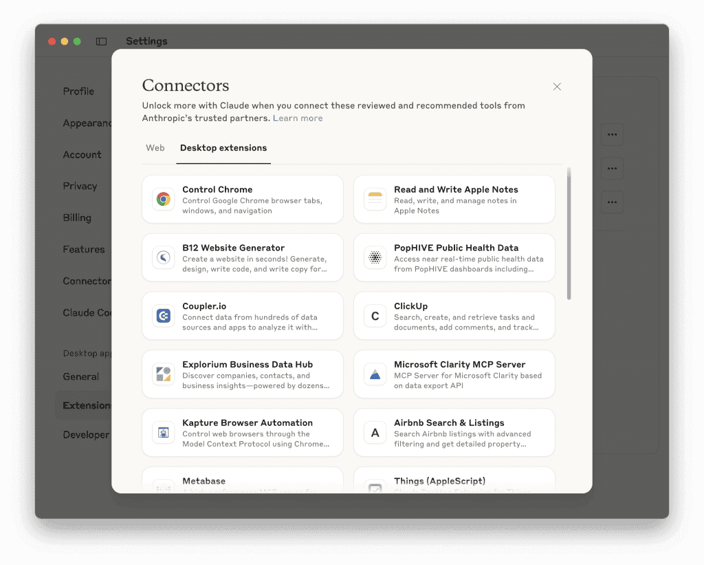 3. Also, I think that there are too many pathways in to connecting other apps to Claude, and I’m not sure how they are all meant to work. Above I have my MCP Toolkit in Docker that’s linked to my Claude Desktop installations, but there’s also Connectors and Extensions(?) and I’m not sure how they’re meant to work. Are they desktop only? Or can I configure them to work no matter where I am (Desktop extensions notwithstanding).
