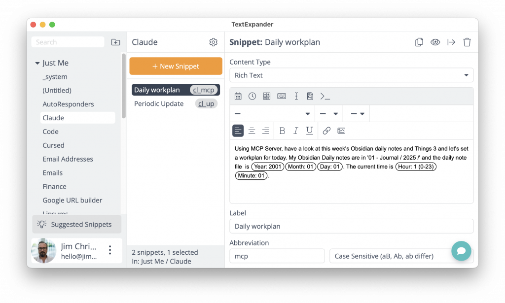 1. I love using MCP server, but Claude sometimes forgets that it has access to it, so I now have two TextExpander expansions that I can execute at the start of my day, and also at regular breaks during my work day.