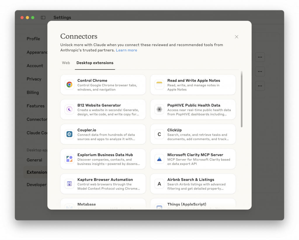 3. Also, I think that there are too many pathways in to connecting other apps to Claude, and I’m not sure how they are all meant to work. Above I have my MCP Toolkit in Docker that’s linked to my Claude Desktop installations, but there’s also Connectors and Extensions(?) and I’m not sure how they’re meant to work. Are they desktop only? Or can I configure them to work no matter where I am (Desktop extensions notwithstanding).