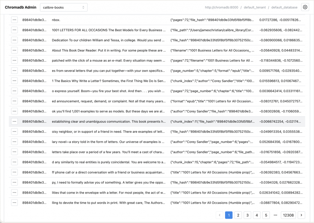 ChromaDB does the heavy lifting. It chunks books into passages, generates embeddings, and enables semantic search. When you ask a question, it finds the most relevant passages across the books you’ve chosen to index.